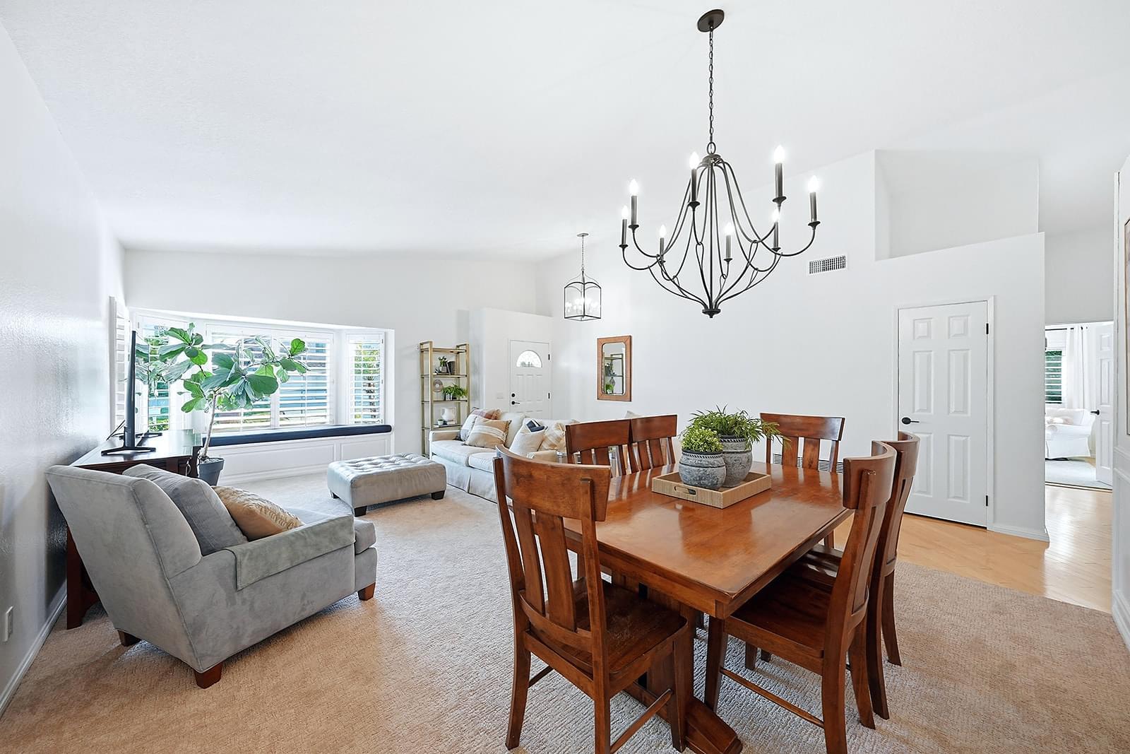 The family room and adjacent dining area has vaulted ceilings and plenty of natural light, providing an ideal setting for entertaining guests.