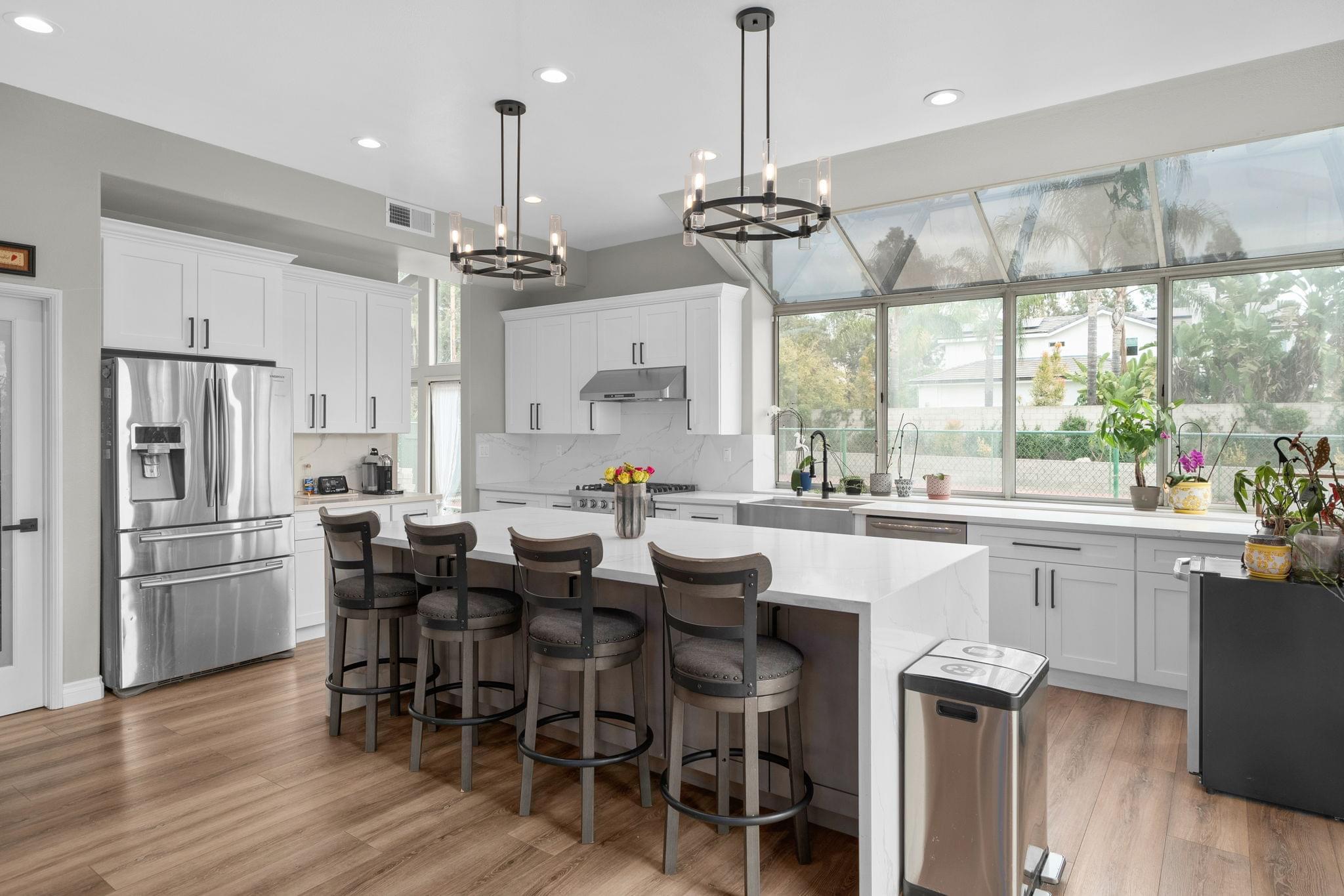 The kitchen boasts brand-new stainless-steel appliances and opens to an expansive layout perfect for both intimate gatherings and grand entertaining.